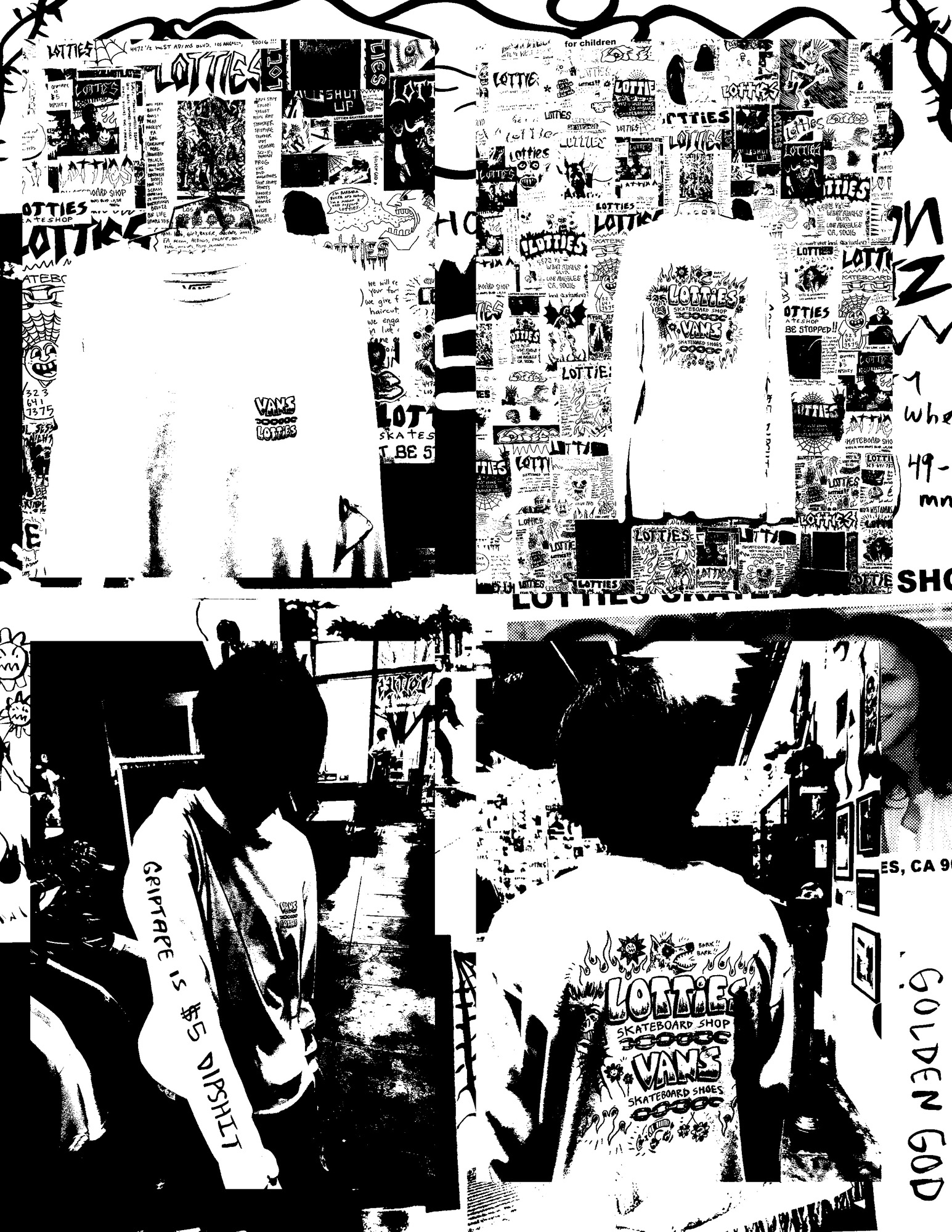어패럴 컬렉션은 클래식한 핏의 숏슬리브 티셔츠와 롱슬리브 티셔츠로 구성되었습니다. Vans x 로티스 로고를 커다란 스케일로 채워 넣은 숏슬리브에는 마찬가지로 로티스의 슬로건 문구가 함께 프린트되었습니다. 마찬가지로 Vans x 로티스 로고를 프린트한 롱슬리브 티셔츠에도 마찬가지로 거미줄, 강아지, 불꽃 등 다양한 아트워크를 낙서처럼 채워 넣었습니다.